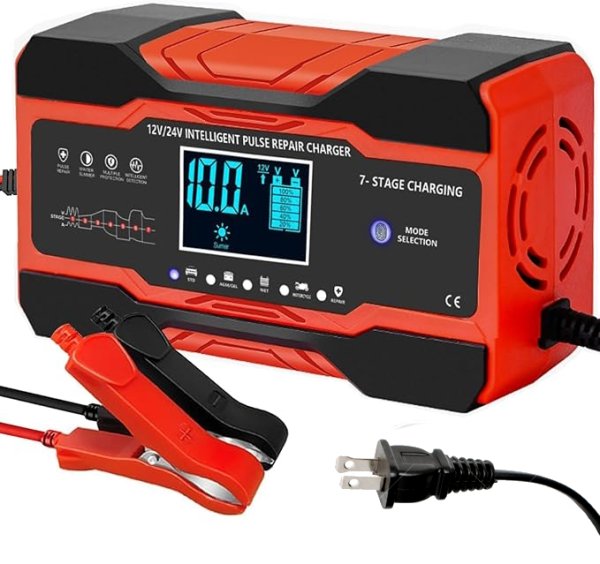 Cargador de batería rápido de 12 amperios: cargador de batería rápido de 12 V, 12 amperios y 24 V, 6 amperios, la velocidad de carga es mucho más rápida que los cargadores automáticos de 8 amperios o 5 amperios. Carga o repara todas las baterías de plomo ácido de 12 V y 24 V para automóviles, marinas y de ciclo profundo, incluyendo AGM, GEL, SLA, inundadas en vehiculos, camiones, SUV, motocicletas, cortacésped, barcos, etc.